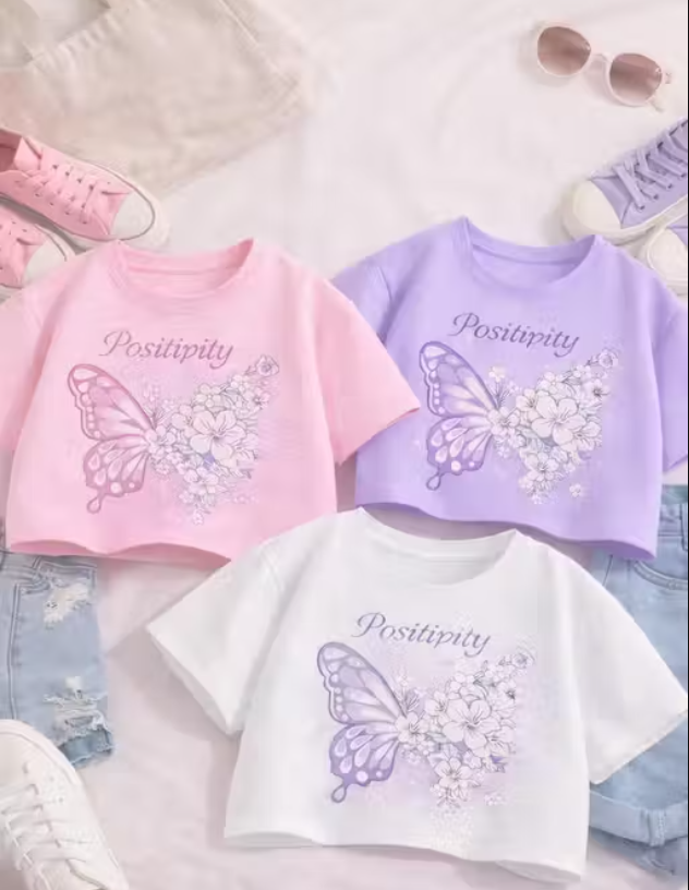 Trendy Girls Printed Crop Top (Pack of 3) Stylish Girls Butterfly Print Crop Tops | Cotton Blend | Pink, Purple & White | Pack of 3